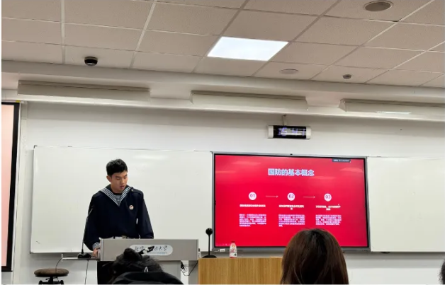 随后,海军退役士兵、校国防教育协会特战队队长、我院大一新生孟彦伯同学围绕“国家安全的基石与保障”展开分享。他从国防多维要素切入,介绍军事、政治等领域在国防建设中的作用,强调“没有国防,其他一切都是空谈”,强调计算机专业在现代化国防中的关键地位。此外,他还详细讲解了征兵条件并分享了自己的军旅故事。在后续提问环节中,他针对“计算机专业部队岗位需求”等问题解答,深情回忆起班长晕船坚守岗位、老班长补给时险些坠船的经历,既表达自身深刻感悟,也展现军人不畏艰难、忠诚使命的风貌,让在场的同学倍受感动。