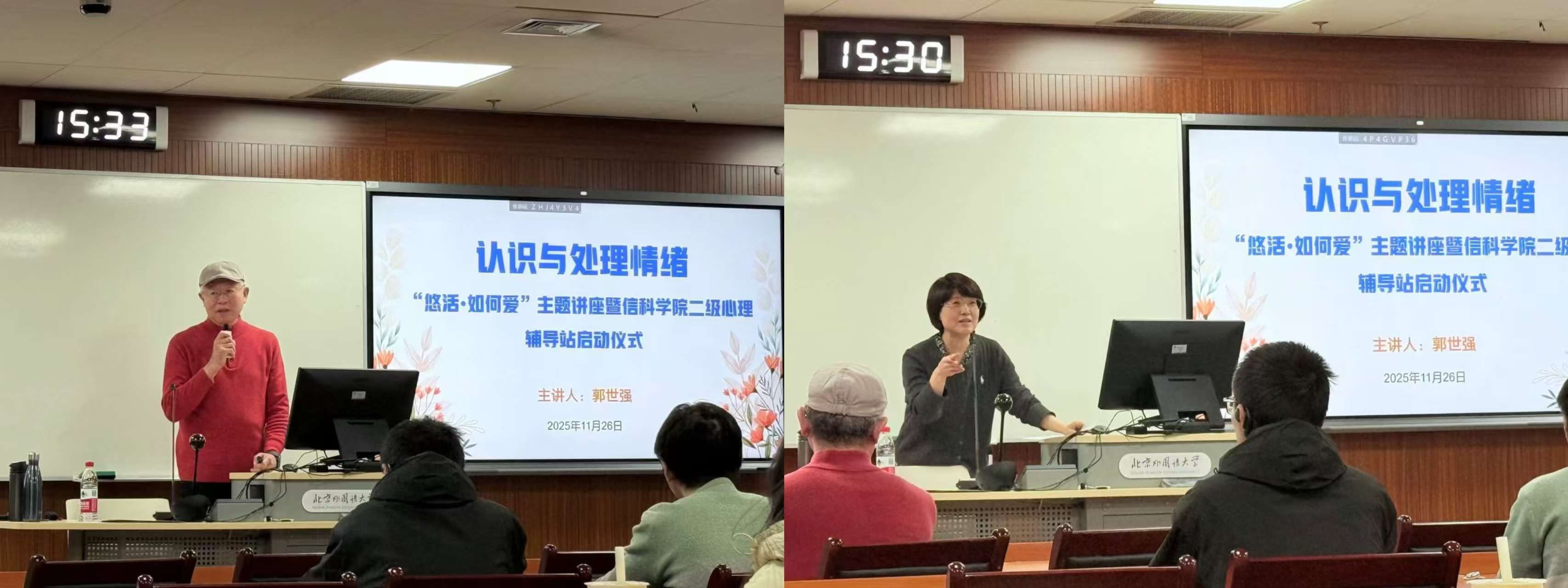 2025年11月26日下午,必赢626net入口首页在国际大厦417顺利举办“认识与处理情绪”——“悠活·如何爱”心理健康主题讲座暨学院二级心理辅导站启动仪式。本次活动特邀请2023年度北外“道德模范”荣誉称号获得者、我校俄语学院副教授、高年级教研室主任郭世强老师为主讲嘉宾,围绕“情绪认知,自我和解,情绪表达”等核心内容展开,为现场参与的信科师生提供了一套科学的心理成长指南。学院党总支副书记刘玉华老师、员工党支部书记兼辅导员赵韵怡老师,以及2025级全体本科生共同出席了本次活动。